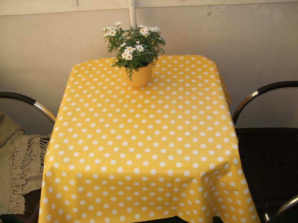Så… Helt ærligt ville jeg sige, at det er en ganske stor altan. Altan er for mig en lille eller større omgang planker, der stritter ud fra en bygning. Hos os ligger den forputtet ind i bygningen og det gør den til et meget hyggeligt, huleagtigt sted at opholde sig. Der er netop plads til 2 stole og et lille bord – et bord, som i anledning af forårsvejret igår fik nyt “tøj” efter en tur til den lokale stofpusher: