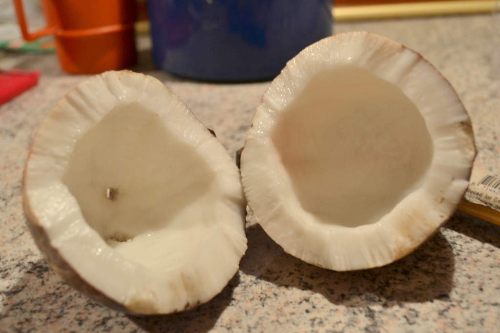 Har I nogensinde prøvet at slå en kokosting i stykker og så få en hel, ubrudt nød ud af det? Den plejer ALTID at gå i to stykker, når jeg har gjort det. Faktisk var nøden sådan lidt “blød” i det, men den smagte nu fint nok. Men igen… det var nok også meget godt den blev slået i stykker, det skulle jo nødig hedde sig at den blev for gammel. Hvad jeg så lige skal bruge de her to til …