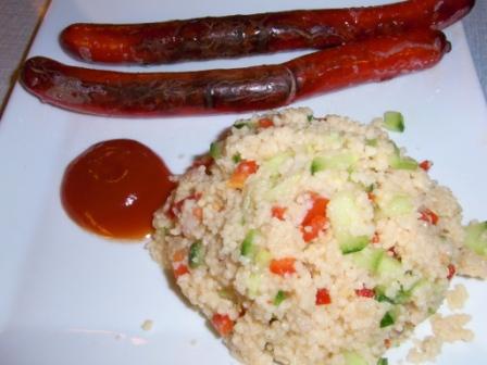 I dagens anledning fandt jeg nogle cous cous-ting på hylden i forrådsskabet, og så havde vi noget agurk, tomat og løg. … ja, bum bum og så hoppede der lige en citron med i og tog sin skal med, og så var der ellers tabouleh til den store fnisende femøre!