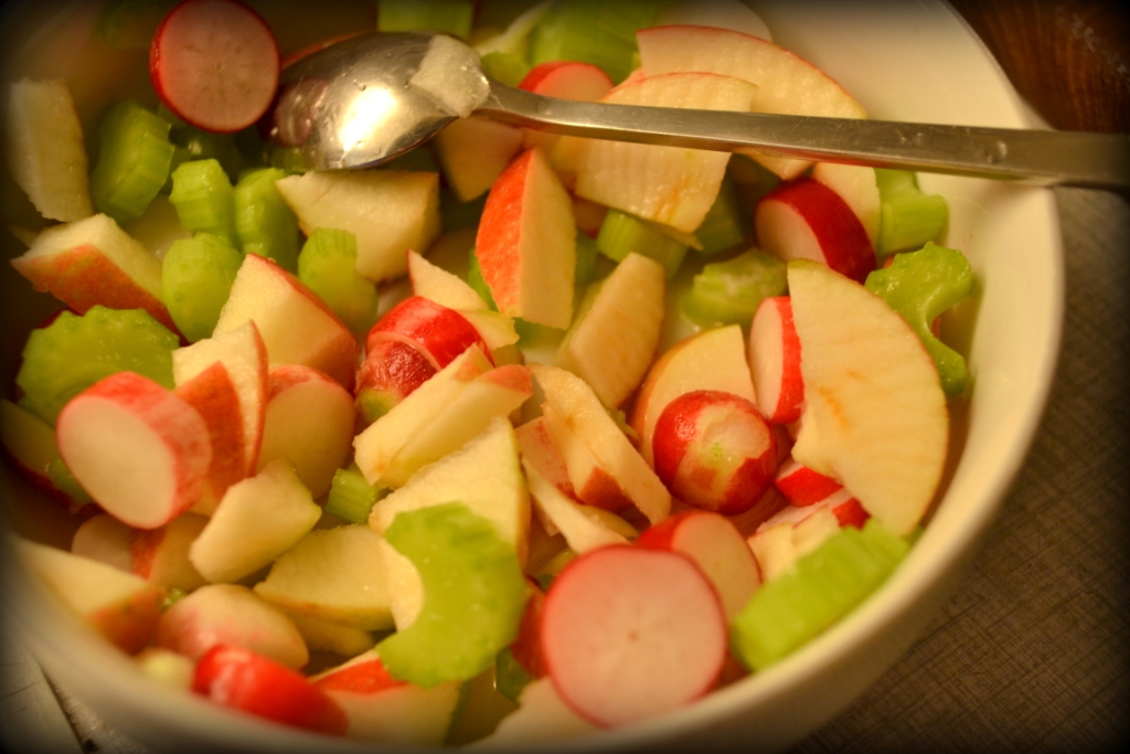 Samtidig blev de mixet med en rest radiser og bladselleri og overhældt med agave-sirup og citronsaft: