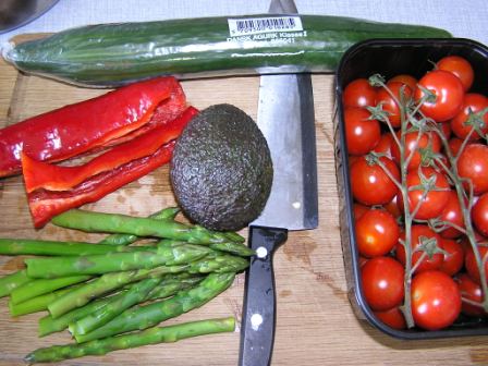 Tilsammen med de øvrige gæster i salatskålen blev det en ganske interessant blanding – ihvertfald meget meget sund! Jeg havde nemlig også lige neglet et bundt asparges – det er ved at være sidst på sæsonen og det kan man godt mærke – både på prisen og bundtet. Jeg mener… SKAL asparges bare lugte totalt klamt, når man møder dem i butikken? Er de grøntsagernes små diamanter forklædt som stinkende vagabonder? Det er virkelig ADVR. Så – jeg prøvede at finde nogen, der lugtede så lidt som muligt og kørte dem igennem en hurtig blancheringsmaskine (aka min elektriske tekeddel):