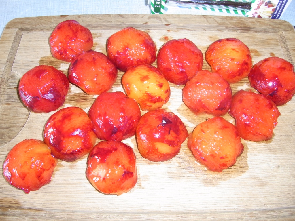 Med en stang vanille, noget sød lakridssirup (nej, jeg siger ikke fra hvem, for jeg er ikke betalt for at fortælle det hihi), et ordentlig hug sukker og naturligvis – blommer, gik jeg igang med arbejdet. Jeg troede først det blev nødvendigt med varmt vand for at få skrællen af blommerne, men det var slet ikke tilfældet – det gik fint: