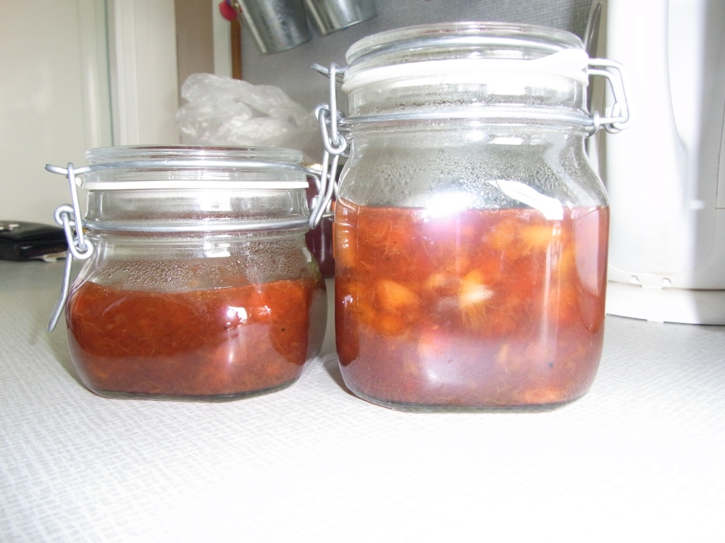Og grydde-grydde-gra – efter få minutters kogning var bærene klar og så hældte jeg blandingen i et par skoldede sylteglas. Jeg brugte kogende vand og æbleeddike, men du kan sikkert også bruge Atamon. Jeg havde ikke noget atamon, så nu må vi se, om jeg får muggent syltetøj.