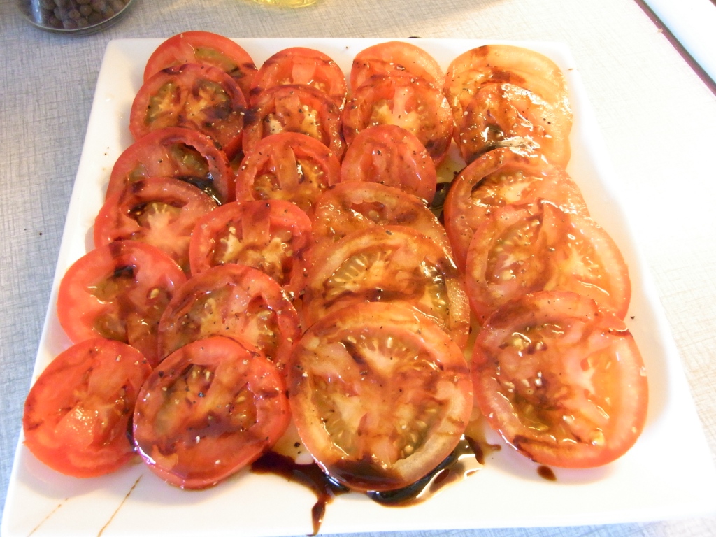 Da vi endelig kunne gå til bords, havde jeg pivstjålet Gorm Wiswehs ide med tomatsalat til svin – så der blev linet op – og jeg prøvede for sjov at genbruge lidt salt lakridssirup ovenpå tomaterne sammen med et skvæt æbleeddike og et drys basilikum. Det lyder utroligt, men siruppen endte med at give den lifligste smag til tomaterne – faktisk noget henad balsamico (som jeg har haft et lidt anstrengt forhold til de sidste mange år fordi jeg ikke kan tåle skidtet). Hvem skulle have troet det – lakridssirup der bliver til balsamico godt hjulpet på vej af æbleeddike? Men det gjorde det altså…