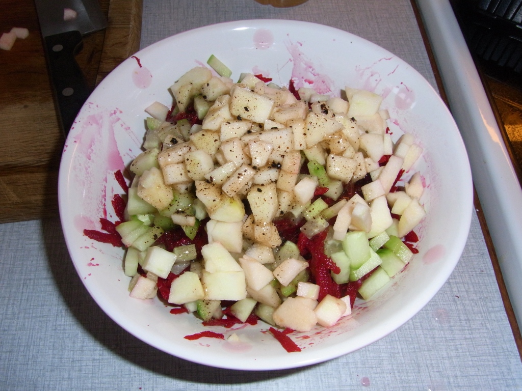 | Rødbeder, æblestykker og agurker (minus skræl) – tilsat dressing med lakridspulver. |