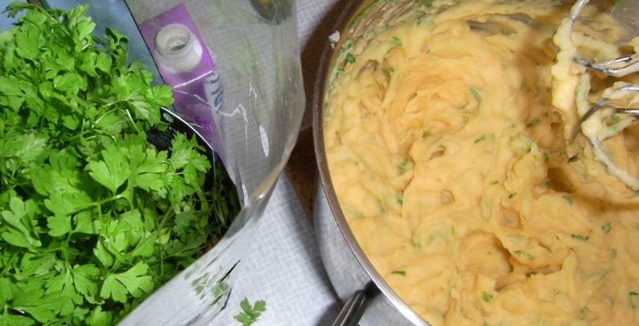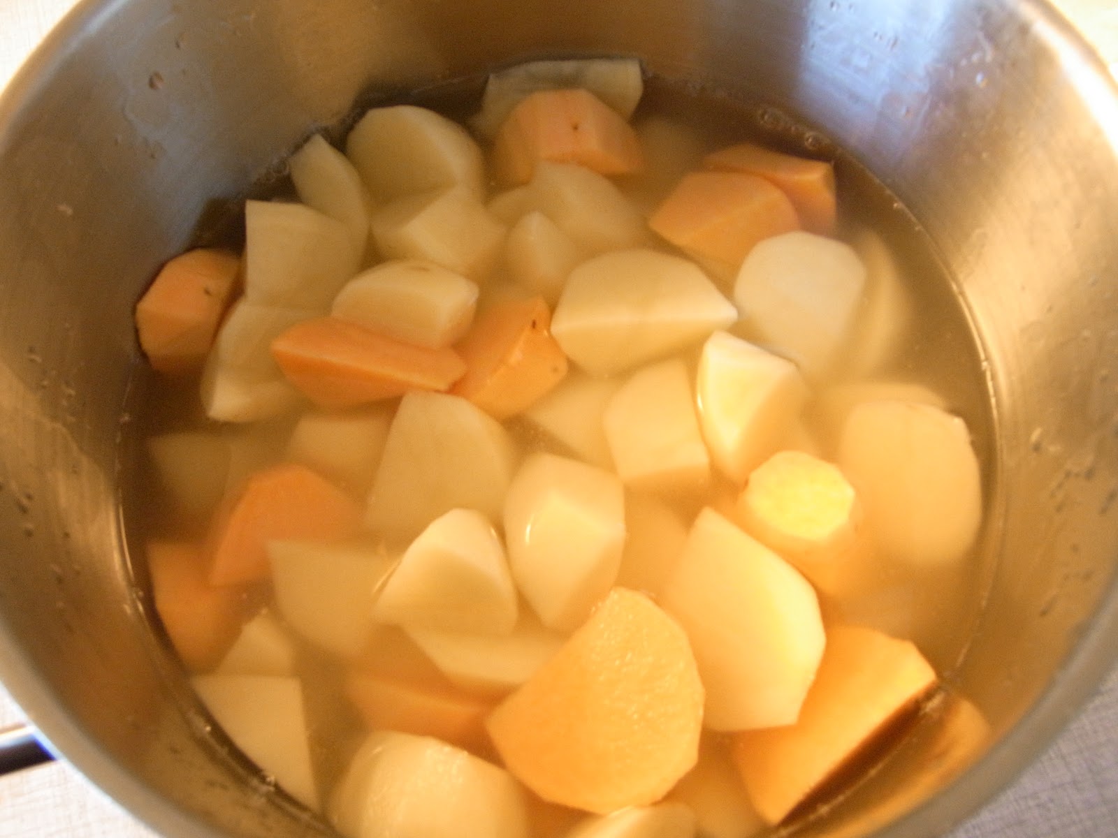 Imens havde jeg klartgjort nogle søde kartofler og almindelige kartofler i en gryde til kartoffelmos. Søde kartofler er en sjov grøntsag – og farven er helt fantastisk:
