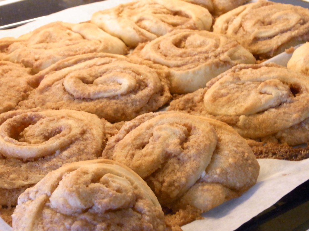 Den ene halvdel blev beklædt med revet marcipan- og kanelmasse og den anden med sød lakridssirup, lidt smør/margarine, et ordentligt strøg sukker, lidt lakridspulver og revet skal af citron. Jeg havde ikke fået købt noget farin, som ellers skal i sådan nogle kanelfætre, så jeg måtte freestyle lidt og huskede at ovennævnte moster Malou vistnok også tidligere har mumlet noget om marcipan i snegle… (Hvis jeg ellers husker ret). Om ikke andet, så blev blandingerne et stort hit – endda også hos kæresten, som har været mere eller mindre heldigt offer for mine lakridseksperimenter… 😛