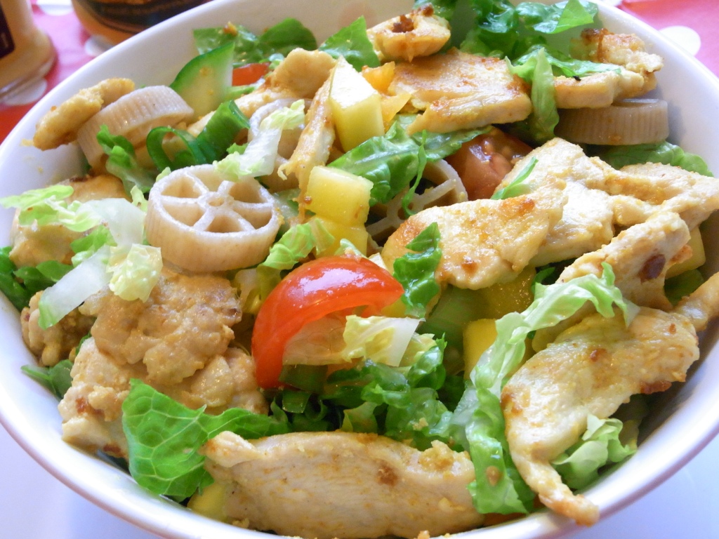 Hos os har vi noget, der hedder “Cafe Vivaldi” – og her får man altså gode salater. Så i ægte cafe-mad-stil skulle vi prøve at lave en lige så indbydende salat som Vivaldi kunne… Og den blev faktisk endnu mere lækker, thi jeg puttede fx friske stykker af mango på, og tilsatte karry til kyllingen istedet for det evige pesto som Vivaldi forurener deres kylling med (og dermed OST!!!!).
