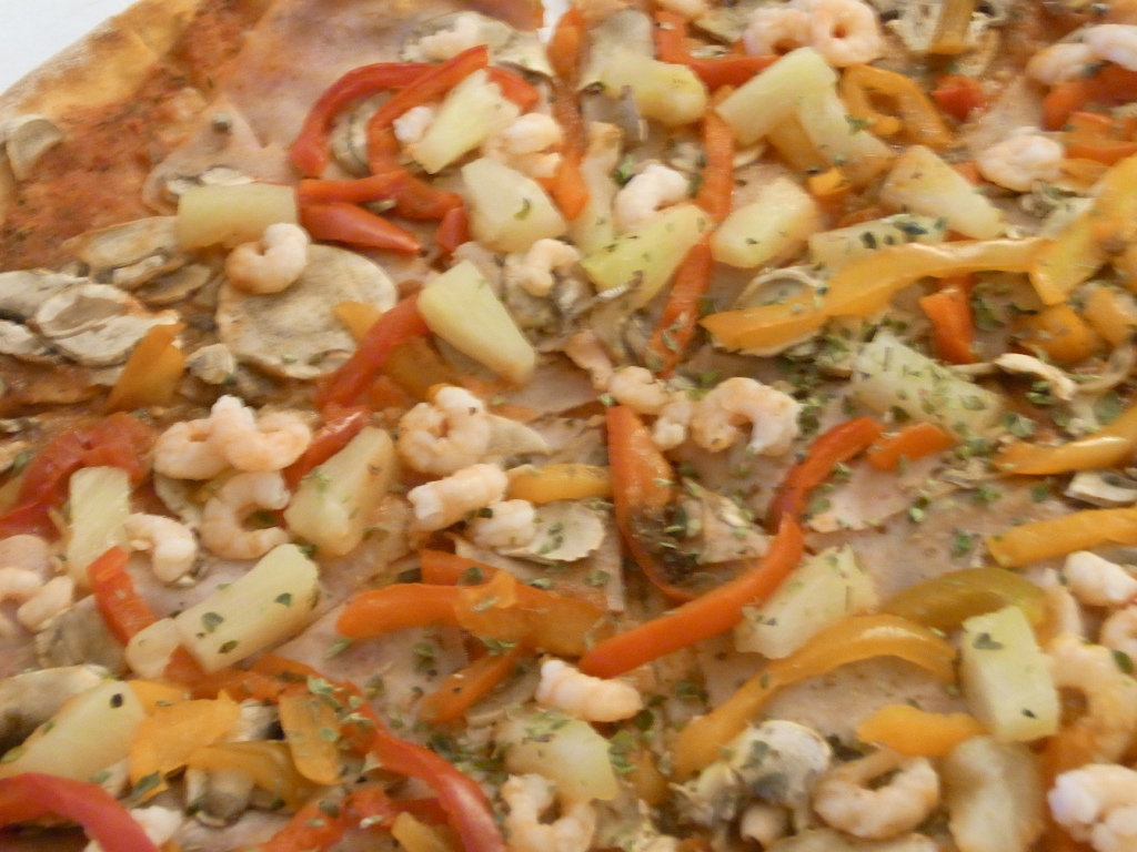 Jeg bestilte en pizza med champignon, rejer, skinke, ananas og paprika. Og den paprika skal jeg altså lige love for var fantastisk. Ihvertfald var den lavet af RIGTIG paprikapeber – med andre ord, den var pænt stærk!!!