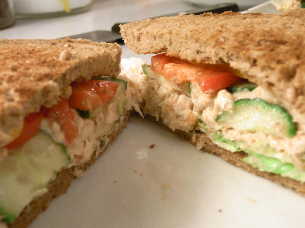Så stegte jeg noget brød på toasteren og puttede lidt grøntsager i de varme rugsandwich-stykker: