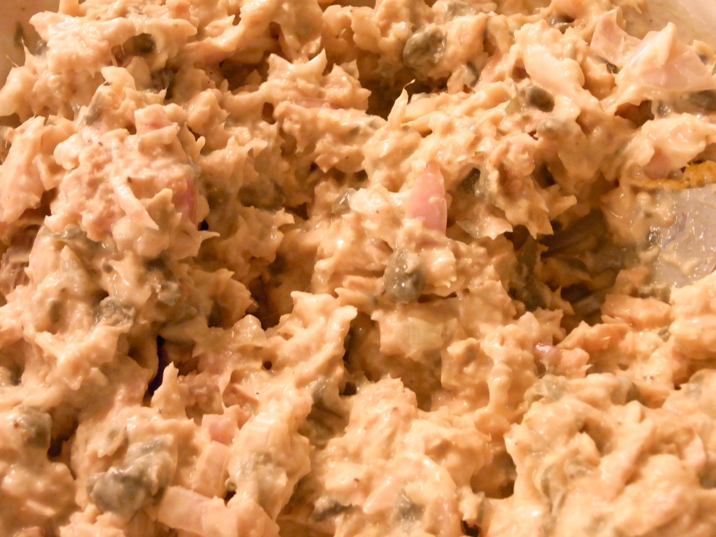 Nå, så var gode dyr jo rådne så jeg måtte freestyle – og det valgte jeg at gøre med en dåse tun, et glas kapers og en helvedes masse Miracle Whip (og Miracle Whip er altså ikke helt så fedt som mayo, så det er ok!)