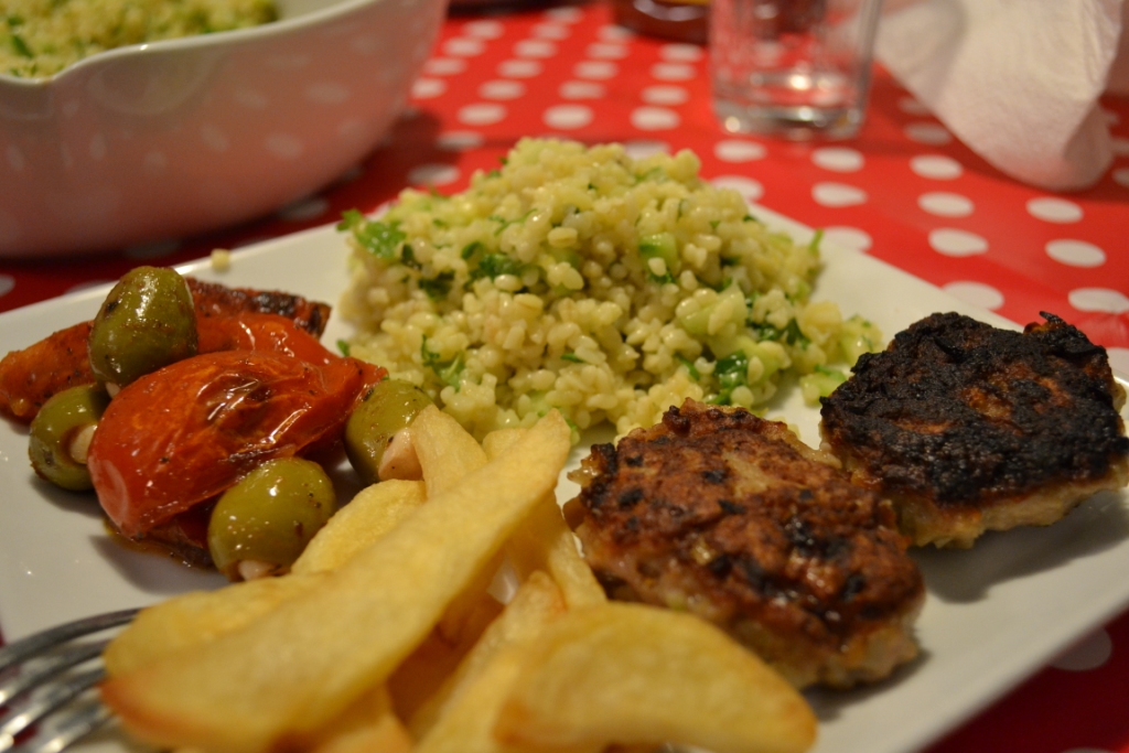 De røde dimser ved siden af pommes frites’ne er pandegrillede tomater med fyldte oliven.