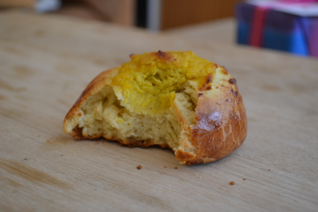 Bollerne fik en anelse for længe i ovnen, hvorfor det lettere solbrændte udtryk får dem til at ligne grovboller med æggeblommer oveni. – Temmelig langt fra det perfekte eksemplar på Amo’s egen side.