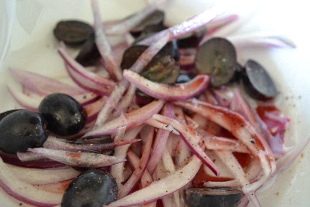 Efter en pludselig indskydelse fandt jeg på at putte halverede, stenfri, røde druer i løgene – havde en fornemmelse af, at deres sødme ville give en genial modvægt til de røde løg og syren.