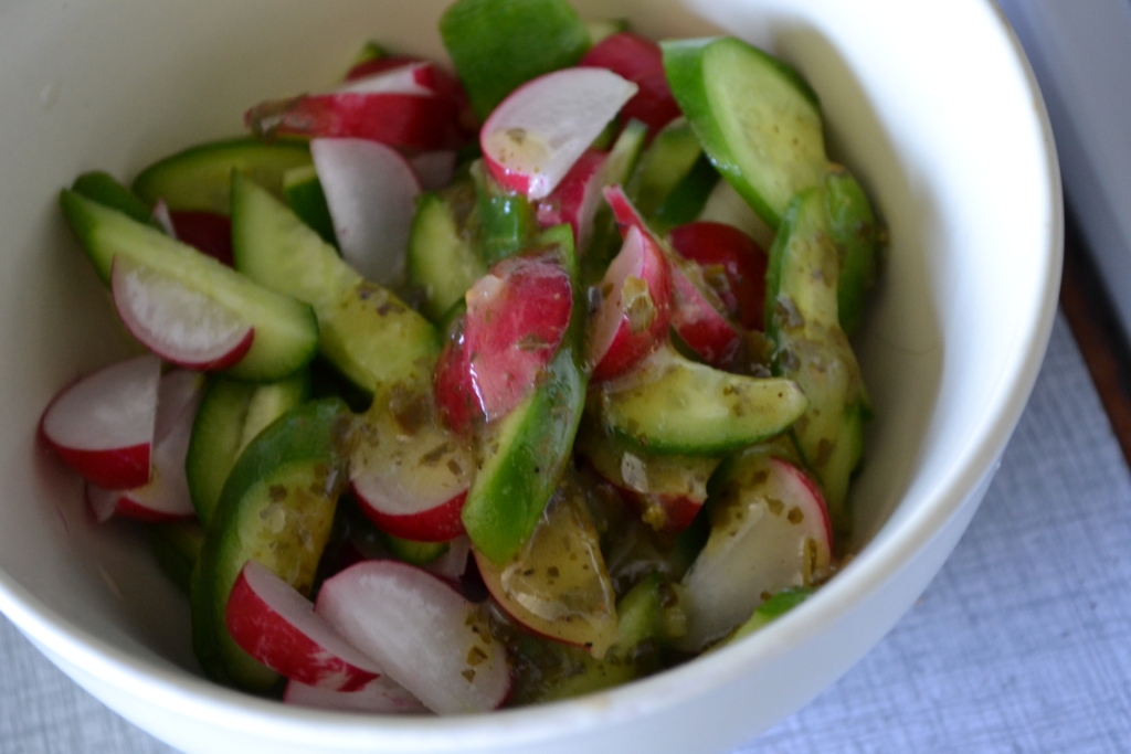 Den første var en lille salat af mini-skoleagurker, røde radiser og pestodressing (uden ost! Weee!) fra Svansø, der smagte skønt til den lille, lette anretning.