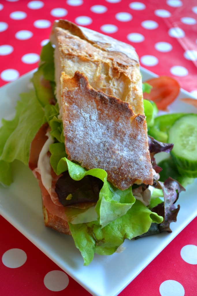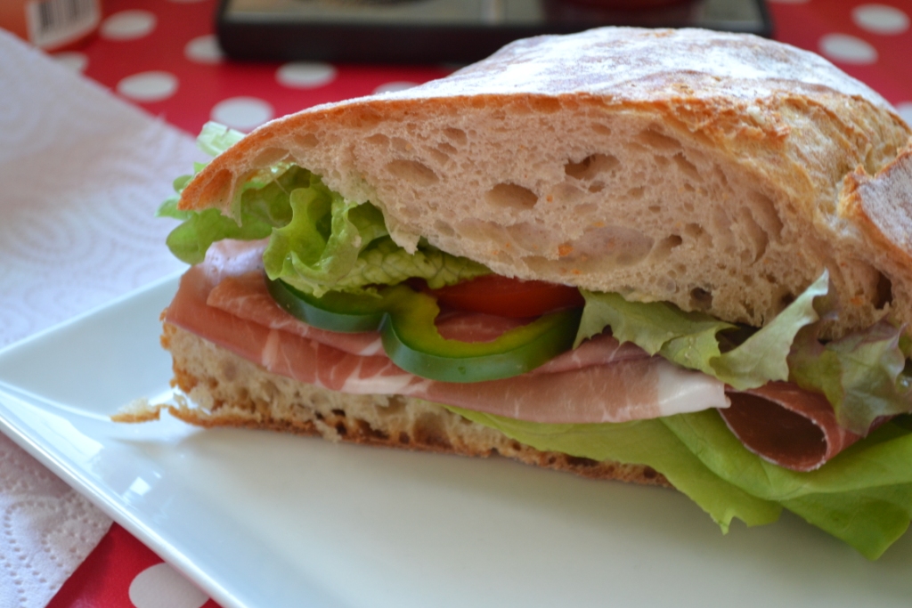 For at fejre denne lille event, var jeg rundt om Lagkagehuset for at fange noget godt brød til en sandwich – og senere rundt omkring Føtex for at hente noget Princip! skinke med hjem. 6 skiver til 40 kroner. Fik ikke lige foreviget billedet af pakken, men lad mig bare nøjes med at sige, at den var skøn! Crudo-et-eller-andet… MUMS! Til det lækre ciabattabrød fra Lagkagehuset, var der sgu ikke et øje tørt…