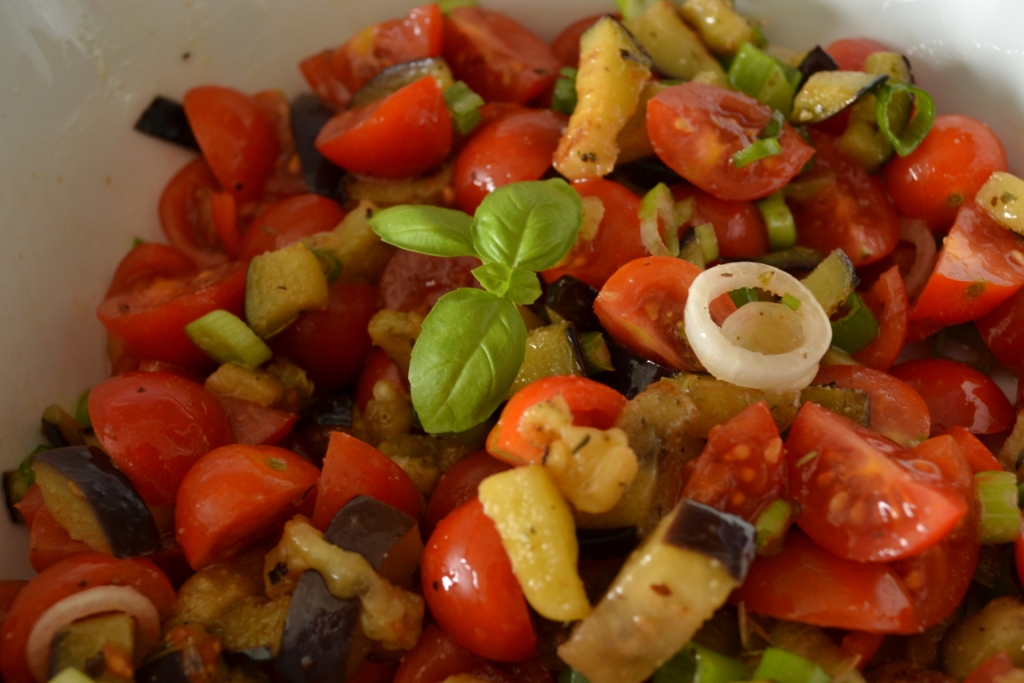 Auberginerne fik en omgang salt og da de lå og hyggede sig på panden tilføjede jeg lidt herbs de provence og hvidløgssalt, thi den lilla, spøjse fyr primært smager af det tilførte krymmel og ikke så meget andet. En god gang olivenolie var også en kærkommen ven på den varme overflade. Bagefter smed jeg dem over på fedtsugende papir – også kaldet køkkenrulle: