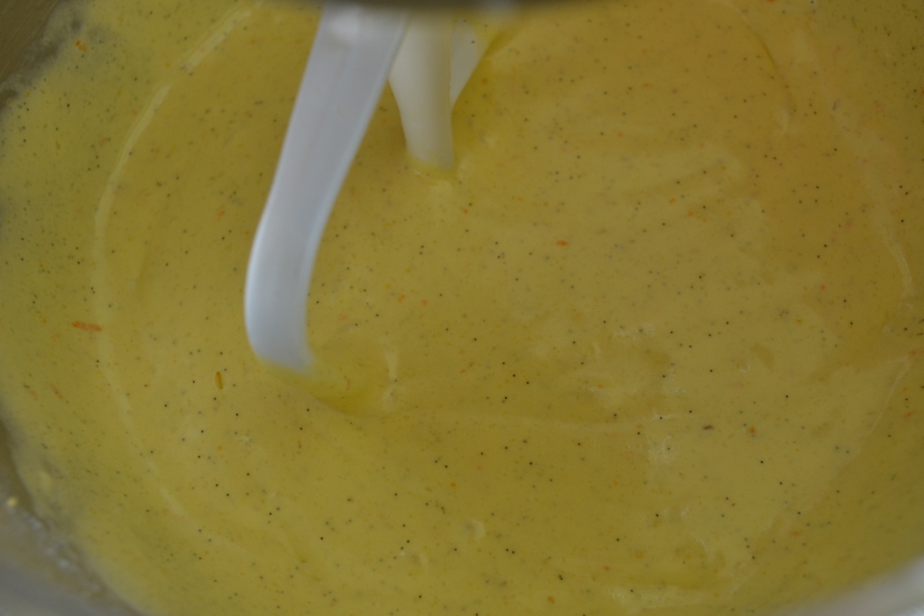 Vaniljestangen blev flækket og ned kom vaniljekorn. Appelsinerne blev skyllet og skrællen taget af – og tilføjet det øvrige. Se lige den orange farve – den var SÅ smuk! Og duftede helt fantastisk.