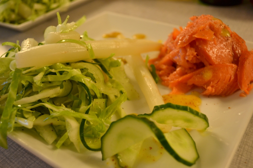 Det var en rigtig fed kombi, sådan noget fintsnittet kål og agurken. Og det passede perfekt til den røgede, fede fisk:
