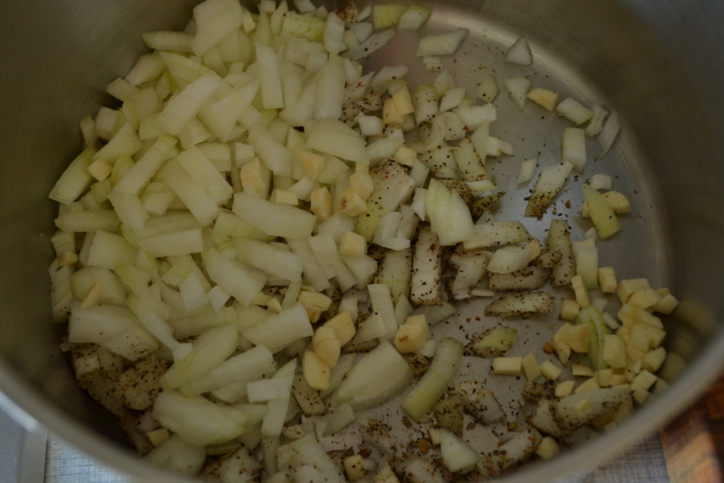 Først blev der skrællet en seriøs mængde løg og hvidløg – og jeg kom til at bruge 3 fed hvidløg pga. et lille uheld med peberdåsen. Ups. Nå, sådan er det. Det passede sikkert meget godt, da det blev en ordentlig røvfuld grøntsagsgryderet.