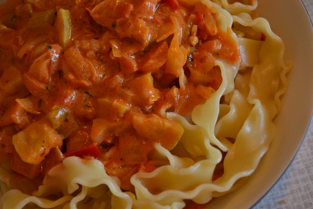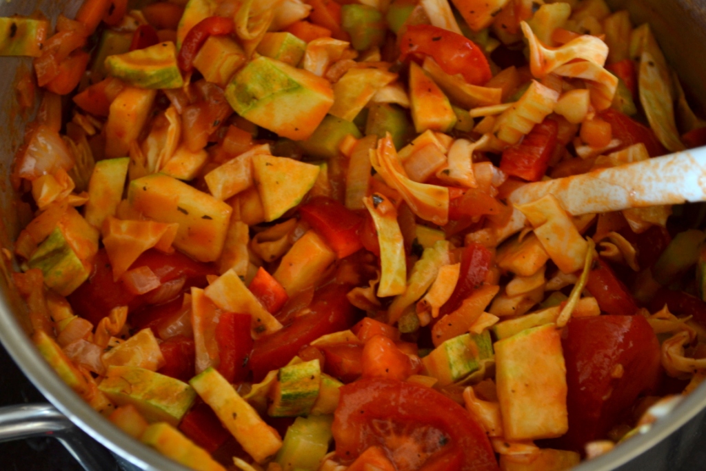 En rød tomat-trio slap heller ikke. Jeg havde ingen hakkede tomater til at gøre saucen egnet til pasta, så jeg måtte bruge de rå udgaver – og en gavmild mængde tomatkoncentrat fra dåse…