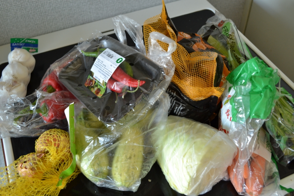 Holy shit, der var da en del, tænkte jeg, men besluttede mig alligevel for at bruge det hele. Det skulle jeg aldrig have sagt. Det tog mig sikkert lige så lang tid at skære til og koge-brase som det ville have taget mig at købe ind og lavet en nemmere mad. Nå, men da jeg nu ikke lige gad og gå udenfor ikke… Så startede jeg med at choppe og snitte og hakke, så grøntsagerne stod rundt om ørerne på mig. For kød havde jeg sgu ikke lige i huset den dag. Så ikke kun fik jeg udnyttet mit køleskab i bedste StopSpildAfGodMad – jeg fik også gjort min borgerpligt med en kødfri dag om ugen. Huzza!