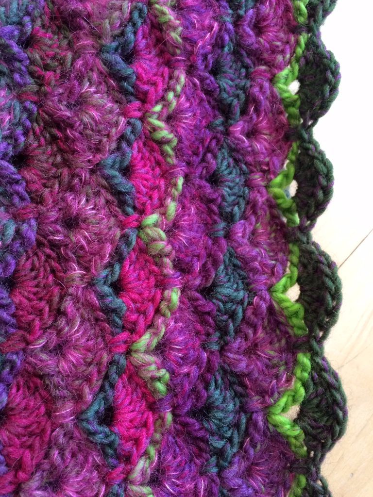Som et ekstra fif havde jeg indhæklet en tråd af det fineste Kid Silk i hver anden omgang – en tynd tråd af 75% mohair og 25% silke for at give blødhed og afveksling i mønsteret. Især i halsen kan sådan noget uldtøj kradse ad h.. til og derfor er det et klart plus at tilføje nogle bløde tråde til at gøre følelsen sådan ekstra “blød og fluffy” og “kløfri”. Hvis du vil gøre kunsten efter, så skal du bruge 3 nøgler Kid Silk til hele ponchoen og bruge den på hveranden omgang.