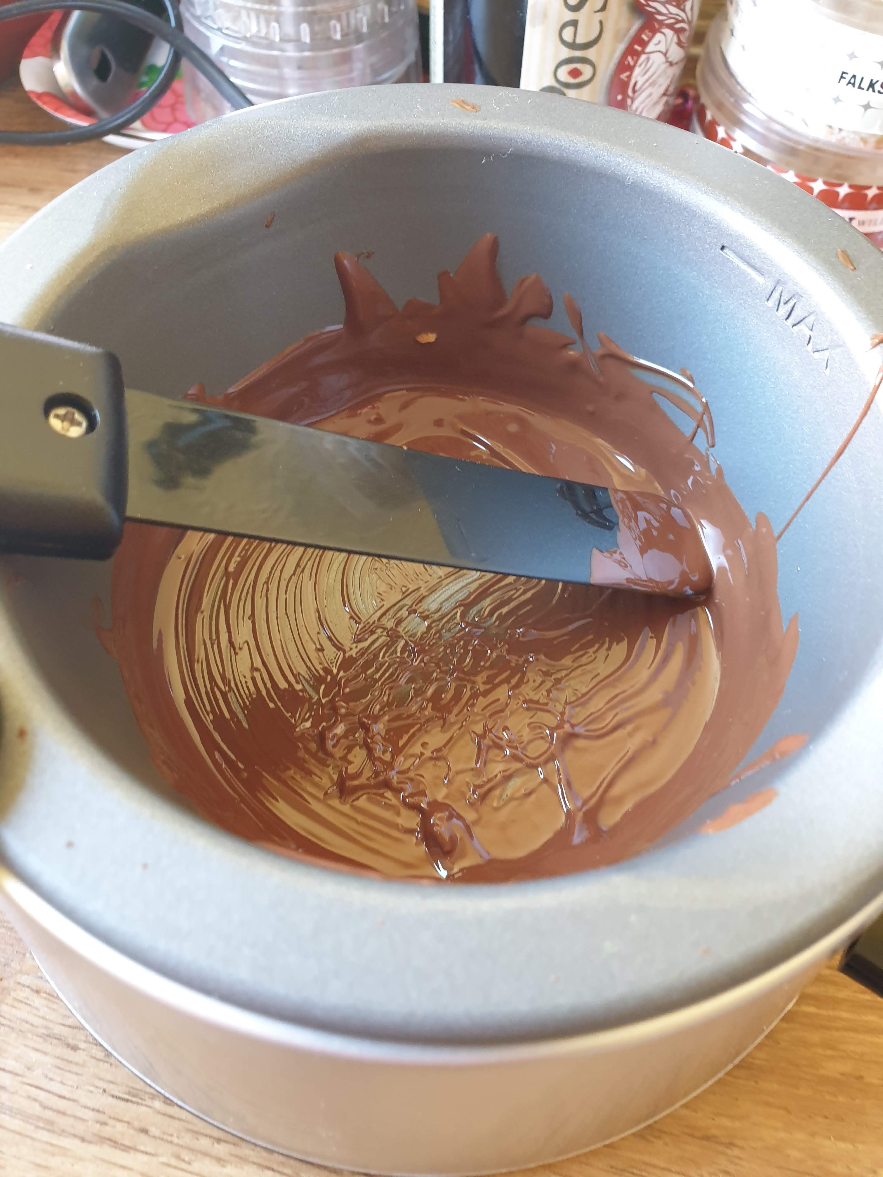 Når de er bagt og blevet gyldne på toppen efter en hedetur, tager du da din chokoladesmelter (Åh jo – troede du ikke, der var nogen, som brugte sådan en fætter mere? Well, think again!)